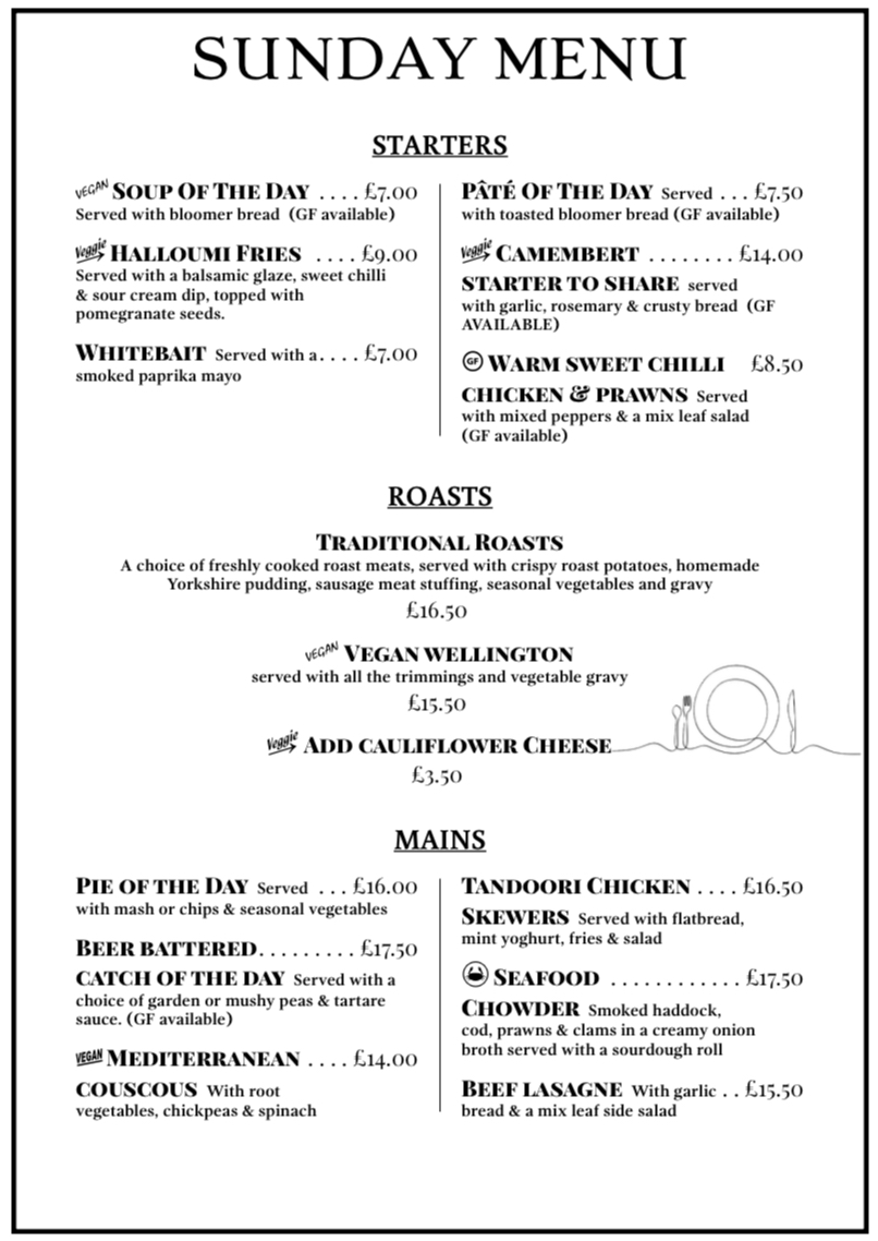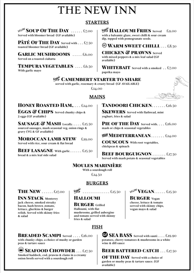 You are assured of a warm welcome at the New Inn, Paul and the team have many years experience of providing the highest standards of service and hospitality with flair and originality. Our menus contains a wide variety of dishes prepared from the finest produce which is sourced locally where possible with a New Inn twist by our talented chefs. Menu choices include steaks, fish, seafood, game plus many more familiar pub classics cooked with great quality ingredients and culinary flair. Our Sunday lunches are legendary, choose from a selection of roasts plus our varied specials board including steaks and fish options and delicious vegetarian choices.